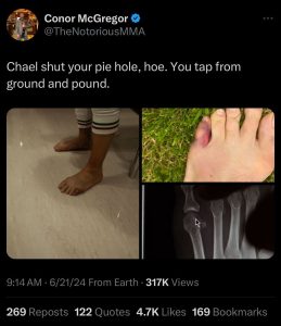 “I believe where he is and what he’s doing with his time is rehabilitating himself, which is awesome. He wants it to be known that he is not rehabilitating himself, he instead is repairing himself. Out of all the parts of his body that could be hurt, it’s specifically a pinkie toe? He just didn’t put out any evidence that it was his pinkie toe, and that is a surprise to me. So Conor refused my compliment, that he had the strength to seek help. You can listen to Conor’s account which makes him look a little b****.”