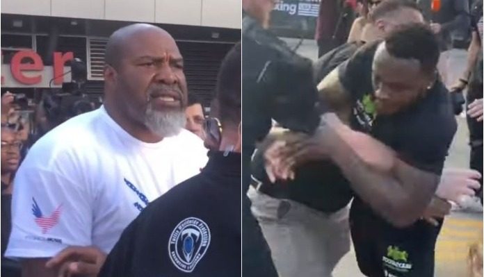 Sky Sports Boxing was in the middle of doing a broadcast when the fight happened and they caught security holding back Riley in the video above.