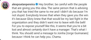 “Hey brother, be careful with the people that are giving you this idea,” Pereira replied. “The same person that is advising you that has tried the same to me and I didn’t do because I’m not stupid. Everybody knows that when they gave you the win it’s because Glory knew that that would be my last fight in the organization and they didn’t want me to leave with the belt!