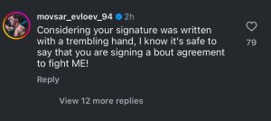 “Considering your signature was written with a trembling hand, I know it’s safe to say that you are signing a bout agreement to fight ME!” Evloev replied to Sterling.