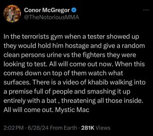 “In the terrorists gym when a tester showed up they would hold him hostage and give a random clean persons urine vs the fighters they were looking to test,” McGregor claimed. “All will come out now. When this comes down on top of them watch what surfaces. There is a video of khabib walking into a premise full of people and smashing it up entirely with a bat, threatening all those inside. All will come out. Mystic Mac.”