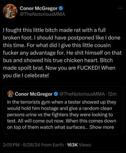 “I fought this little bitch made rate with a full broken foot,” McGregor tweeted. “I should have postponed like I done this time. For what did I give this little cousin fucker any advantage for. He shit himself on that bus and showed his true chicken heart. Bitch mad spoilt brat. Now you are FUCKED! When you die I celebrate!”