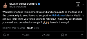 “Would love to take this moment to send and encourage all the fans and the community to send love and support to #JalinTurner Mental Health is serious! I still think you’re too young to retire but I hope you get the help you need, and comeback stronger!! Jesus is the way!!”