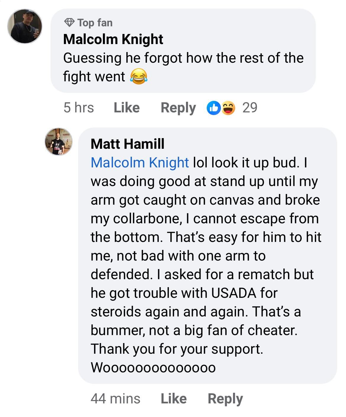 “Lol look it up bud,” Hamill replied. “I was doing good at stand up until my arm got caught on canvas and broke my collarbone, I cannot escape from the bottom. That’s easy for him to hit me, not bad for one arm to defended. I asked for a rematch but he got trouble with USADA for steroids again and again. That’s a summer, not a big fan of cheater. Thank you for your support. Woooooooooooo.”