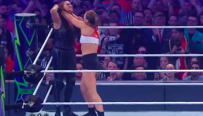 Last night, amid the exciting WrestleMania 34 festivities, former UFC women’s bantamweight champ Ronda Rousey partook in her first WWE match, teaming up with fellow Olympian Kurt Angle to thrash HHH and Stephanie McMahon.