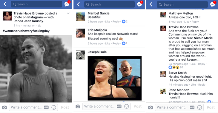 “Hapa” recently posted a photo of his woman crush and fiancee to his personal Facebook page where he hashtagged her as his #womancrusheveryf*ckingday. One Facebook troll posted a comment under Browne’s post mocking Rousey and Browne was quick to fire back and even tagged the troll’s significant other to top things off.