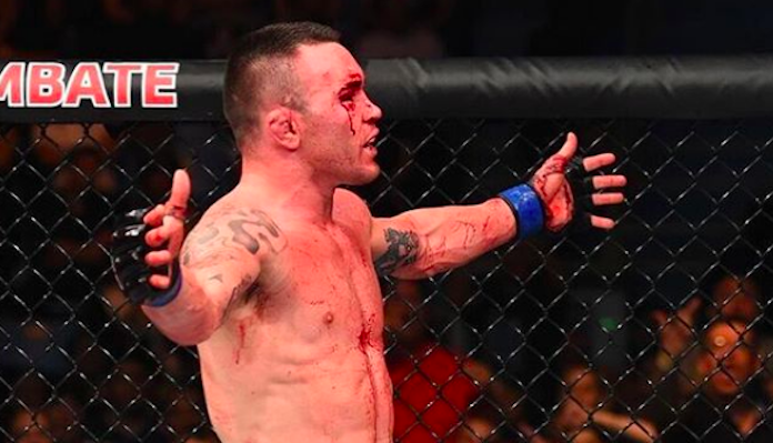 Round one of tonight’s UFC 225 co-main event begins and Covington rushes forward with punches. He shoots in and scores an early takedown. Rafael fights his way back to his feet but Colby is all over him. He slams RDA to the floor. But Rafael pops right back up. Covington with an uppercut while he has dos Anjos pressed against the cage. He lands a left hand. RDA breaks free and fires off a low kick. Colby presses forward and pushes him against the fence. He works in some knees and punches before RDA breaks free. Colby continues to press forward. RDA’s ear appears to have exploded. It is bleeding everywhere. Covington gets a hold of RDA and presses him against the cage he lands a right hand and Rafael breaks free. RDA is trying to get some momentum but Colby is just all over him. Finally RDA lands a big kick to the body. Colby shoots in and tries to secure a single leg takedown. It is not there. The fighters get back to standing and Colby instantly shoots in for a takedown. RDA defends and the horn sounds to end round one.