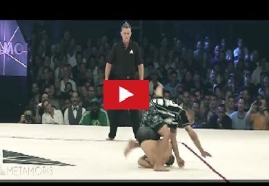 This clip comes to us from Metamoris 4, where Jeff Glover went at his opponent backwards to bait him into jumping over him. Baret Yoshida took the bait, and as a result Jeff Glover performed a front flip and landed with a heel hook on Yoshida. While he was unable to finish the submission, this move is incredibly impressive.