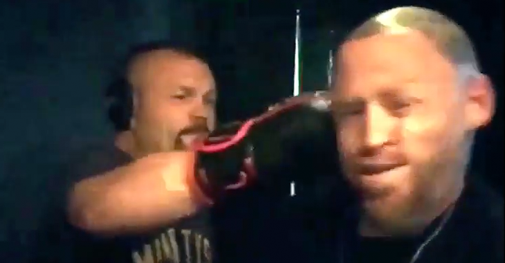 Apparently, Radio host Jason Ellis was up for the challenge and let the UFC Hall of Fame legend clock him right in the face with a boxing glove on.