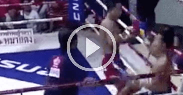 During this Muay Thai fight one guy gets stunned by a punch, backs up into the ropes, bounces off of them and then suffers an elbow fight to his head. Goodnight. The fighter dropped immediately from the brutal strike and the ref stopped the bout.