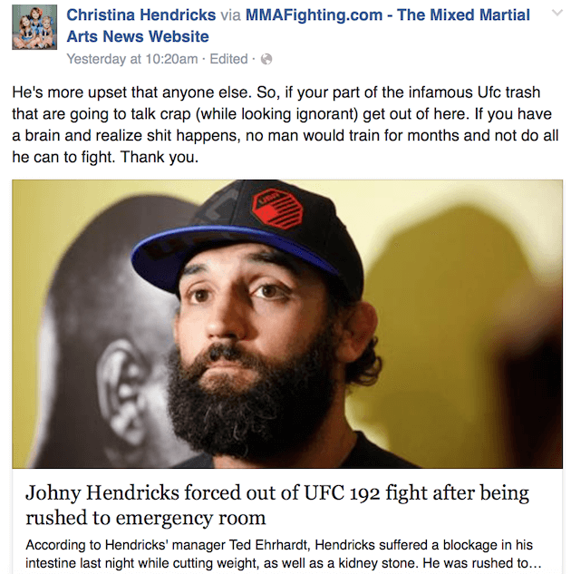 So yeah, Hendricks took a beating online, but his wife decided to stand up for her man took to Facebook to give her own thoughts on all the ‘ignorant’ MMA fans.