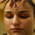 Prior to submitting Ashlee Evans-Smith at the last second of the 1st round at UFC 181, Raquel Pennington ate a nasty knee from Evans-Smith that opened up a cut on her forehead.
