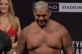 Former UFC heavyweight title challengers Mark Hunt (10-10-1 MMA) and Antonio “Bigfoot” Silva (19-7-1 MMA) went to battle for a second time on the UFC 193 main card in Australia. The fighters trade leg kicks for the first half of the round, obviously respecting the power of the other.