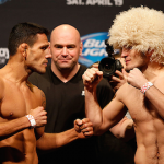 Khabib Nurmagomedov’s strategy in the first round was clear: Keep charging forward and then use the fence to your advantage in landing takedowns. Nurmagomedov controlled the center of the octagon and marched forward with a flurry of blocked strikes until Dos Anjos’ back was against the fence. That’s when Nurmagomedov would dip down and use brute strength to take Dos Anjos to the ground.