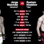 Khabilov opened up the first round with a thunderous overhand right that let Masvidal know he was not to be underestimated. Jorge Masvidal let it be known that although he got cracked with a decent shot, it did not phase him and he continued to press forward. The two exchanged some decent shots throughout the opening round but the most impressive stat is that Masvidal stuffed all of Khabilov’s takedown attempts. This clearly gave Masvidal confidence as the fight was approaching the second round.
