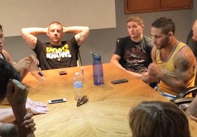 Team Alpha Male held a meeting, and while no details are known about what occurred during the meeting, everyone looks fairly tense. It is no secret that former head coach Duane Ludwig and Urijah Faber have a rocky relationship, and it is interesting to note that both men are seated at the heads of the table.