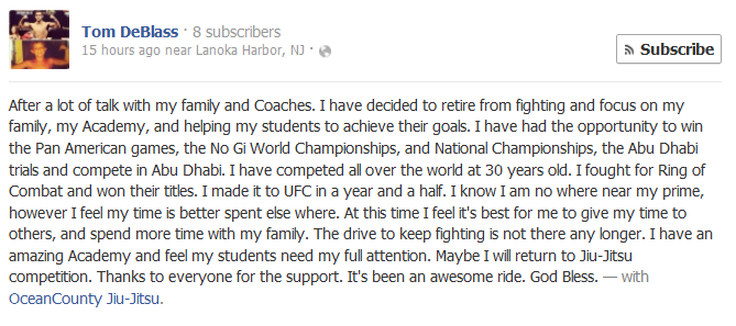 New Jersey native and UFC middleweight fighter Tom DeBlass took to his Facebook page to officially announce his retirement from the sport of Mixed Martial Arts.